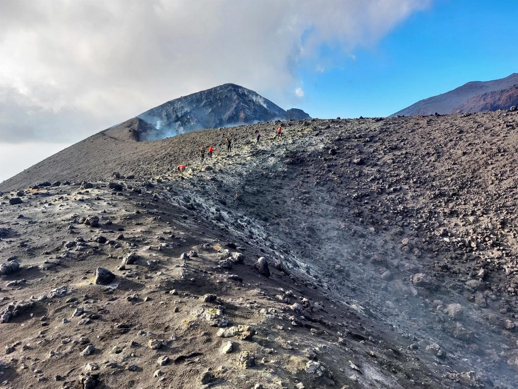 Las últimas candelas del volcán presentan aún roca semifundida en el lento proceso de enfriamiento del cráter «después de su violenta y asombrosa construcción», ha proseguido la UME.