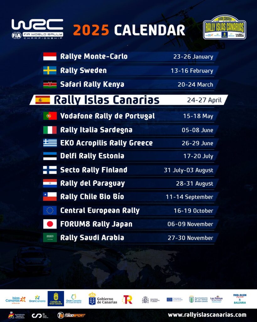 El WRC 2025 contará con un total de 14 citas, incluyendo nuevas incorporaciones como Paraguay y Arabia Saudí. El rally canario, al celebrarse a finales de abril, mantendrá su posición tradicional y ofrecerá a los aficionados un adelanto de lo que será el desenlace del campeonato.