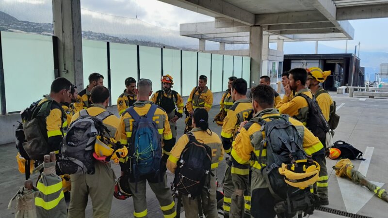 Los miembros de la Brigada de Refuerzo en Incendios Forestales (BRIF) con base en Puntagorda, ya se encuentra en el aeropuerto de La Palma listos para embarcar a las 20:15 en el avión que les llevará hasta la isla de Tenerife para combatir durante toda la noche las llamas en el incendio, según informa en su cuenta de Twitter
