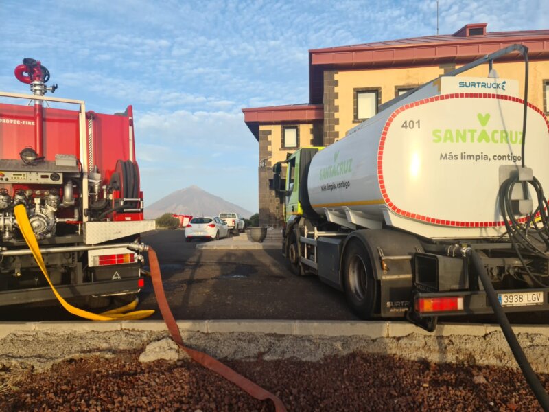 El Ayuntamiento de Santa Cruz de Tenerife ha enviado cinco cubas con un total de 80.000 litros de agua regenerada para llenar los depósitos del Observatorio de Izaña, donde se suministran los helicópteros que se encargan de las labores de extinción del fuego.
