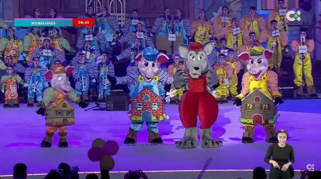 En el ecuador del evento, la murga ‘Los Mamelones’ que han llegado desde la Casa del Miedo, se han subido al escenario, con una fantasía llamada ‘Érase una vez…los 3’ y un diseño Jósua Sánchez.