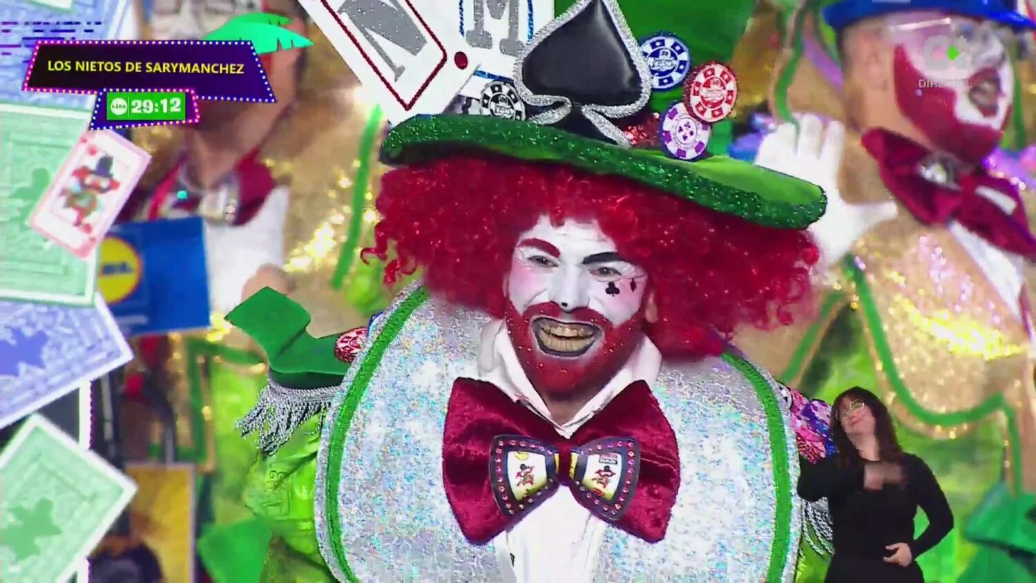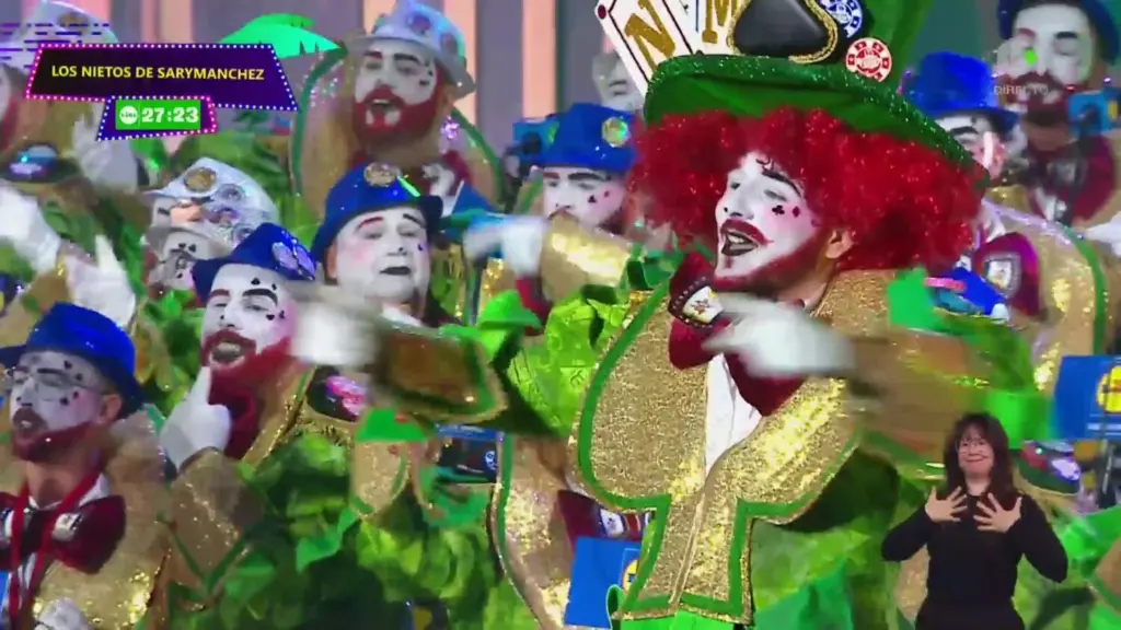 Los Nietos de SaryManchez abrieron el telón desde Telde con una propuesta ambiciosa. La agrupación, que dirige Rubén Santana González, Pitu, presentó a sus 96 componentes bajo una fantasía inspirada en un casino donde el mayor premio es el reencuentro con el público. Los temas elegidos fueron Soldados de la paz y Acaymo.