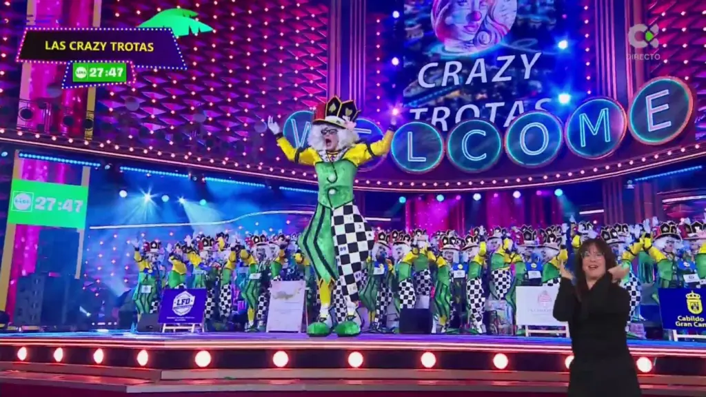 El Risco de San Nicolás también reclamó su sitio en el escenario de la mano de Las Crazy Trotas. Esta histórica murga, fundada en 1999, desplegó a sus 92 integrantes con la fantasía Las Vegas Clown. Leticia Sánchez Santana dirigió un repertorio que viajó entre las canciones Sin identidad y Las viudas del Carnaval, asegurando una actuación equilibrada y potente.