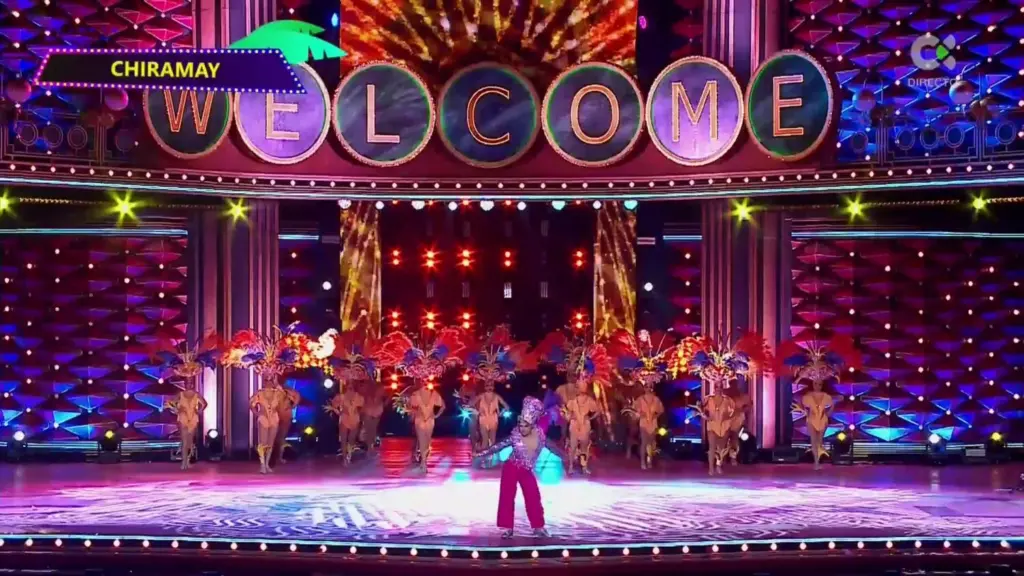 ‘Chiramay’ fue la última comparsa en entrar al escenario, una comparsa proveniente de la Vega de San José y que se fundó en 2013. Sus 34 componentes hicieron honor a su fantasía «Juego de colores» e interpretaron el espectáculo «El renacer».