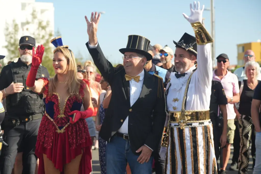 La comitiva arrancó puntualmente a las 17:00 horas desde la Avenida de Italia tras la tradicional cuenta atrás que lideraron las autoridades municipales. El alcalde Marco Aurelio Pérez, el primer teniente de alcalde, Alejandro Marichal, y los ediles Yilenia Vega y José Carlos Álamo encabezaron el inicio de un desfile que, bajo la temática circense, sumó un total de 108 carrozas a lo largo de las avenidas Italia y Gran Canaria.
