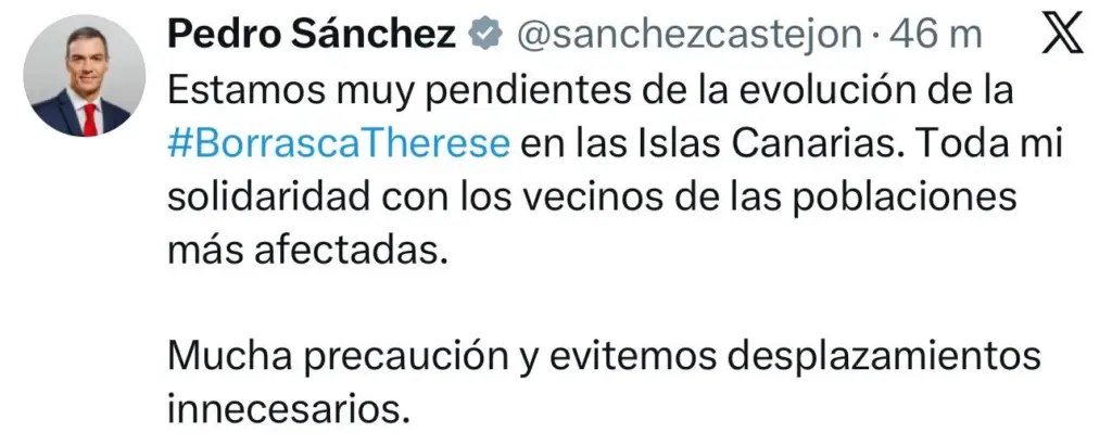 «Agradezco el interés y seguimiento que me ha trasladado el presidente Pedro Sánchez sobre la situación en las islas, tras el paso de la borrasca Therese», manifestó Clavijo en su cuenta de X.