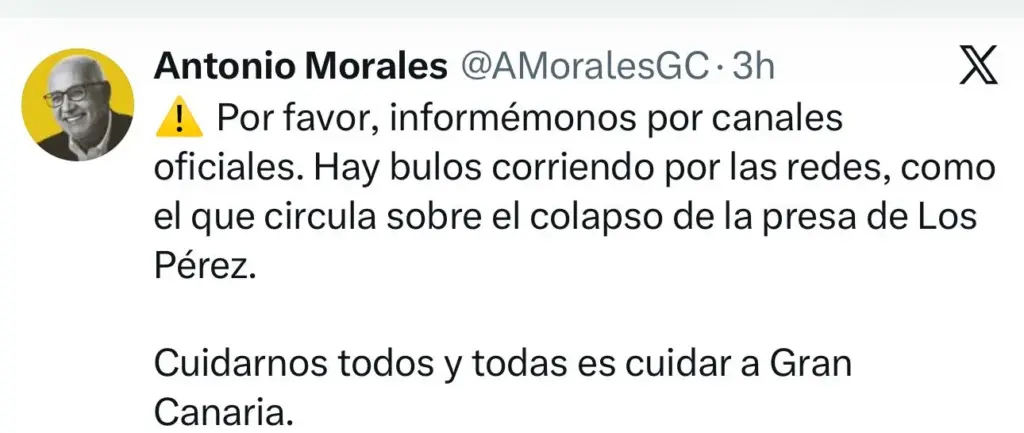 El presidente del Cabildo de Gran Canaria, Antonio Morales, avisó en su cuenta de la red social X sobre distintos bulos que se han difundido sobre el supuesto colapso de la presa de Los Pérez y otras incidencias por la borrasca Therese en la isla.