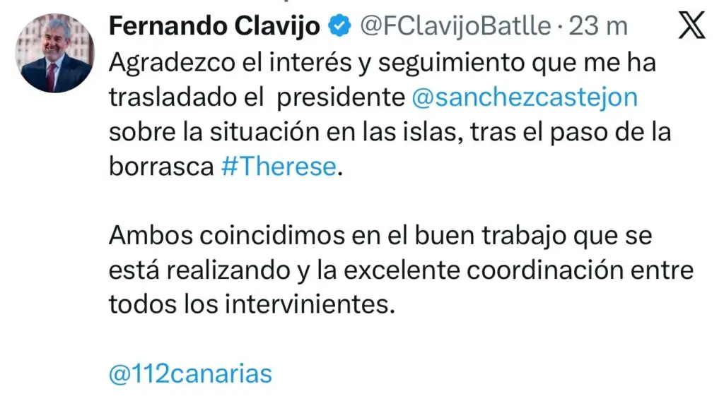 Fernando Clavijo, presidente del Gobierno de Canarias, agradeció a través de la red social X el seguimiento que ha realizado Pedro Sánchez, presidente del Gobierno central, durante la borrasca Therese y su interés por la situación en Canarias.