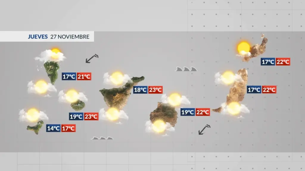 –Fuerteventura: Las nubes bajas por el norte a partir del mediodía podrían dejar precipitaciones débiles por el norte. Viento del nordeste moderado y temperaturas en descenso.