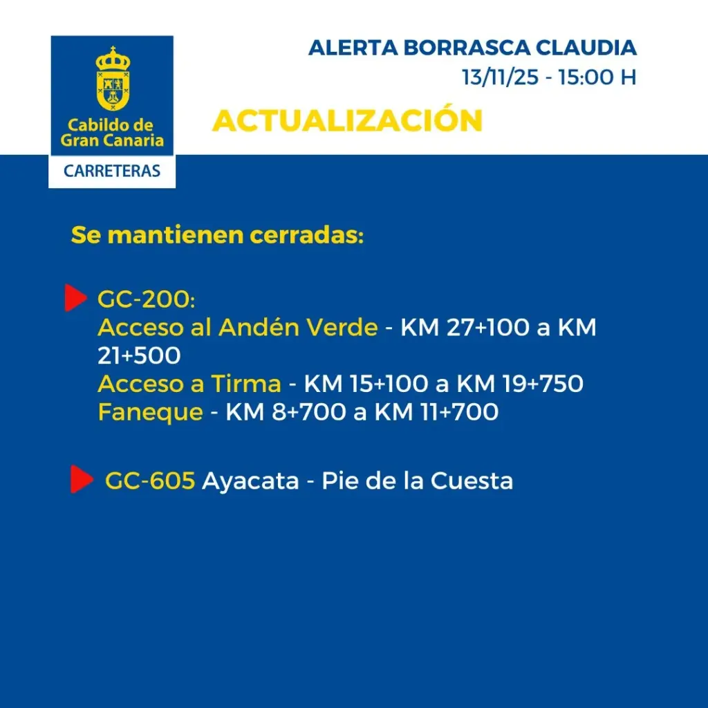 En Gran Canaria permanecen cerradas al tráfico las carreteras del Valle de Agaete GC-231, en su último tramo, el de El Sao; los accesos a Andén Verde, Tirma y Faneque. En la cumbre la GC-210 en Artenara, la de la presa de Las Niñas y por desprendimientos la GC-607, de El Chorrillo, en Tejeda. También se prohíbe circular por el barranco de Tasartico y un pequeño tramo de 200 metros de la GC-60, entre Fataga y Tunte.