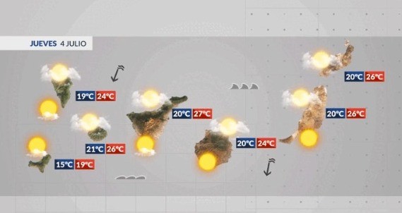 El tiempo trae pocos cambios para esta primera semana de julio, se volverá a repetir el panorama de nubosidad de tipo bajo al norte de las islas más montañosas y cubriendo buena parte del norte y oeste de Fuerteventura y Lanzarote desde primera hora