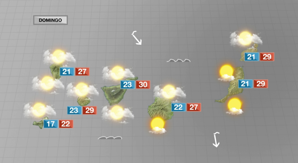 TENERIFE. Por debajo de los 1.100 metros, intervalos nubosos matinales, con predominio de cielos nubosos al final del día, con alguna llovizna ocasional. En el resto de zonas, pocas nubes con intervalos de nubes altas. Temperaturas con pocos cambios en costas, ligero ascenso en cumbres. Viento del norte flojo a moderado, girando a noroeste por la tarde. En cumbres centrales, viento del suroeste moderado.