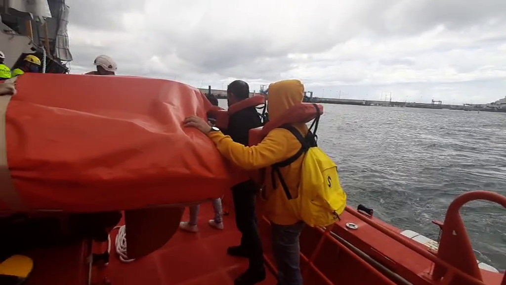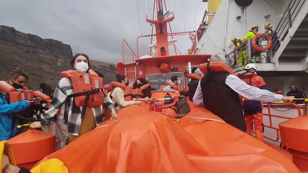 Los 59 pasajeros y parte de la tripulación realizó el transbordo a la Salvamar Nunki, que los llevó a tierra aprovechando la pleamar y la situación actual del mar que permite la operación.