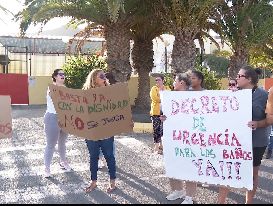 Los familiares del alumnado del CEIP Gran Tarajal se concentraron este martes en la entrada del centro escolar para exigir el fin de las obras de cara al próximo curso. Desde el pasado mes de agosto, el colegio comenzó la reforma de los baños y estas todavía aún no han terminado.