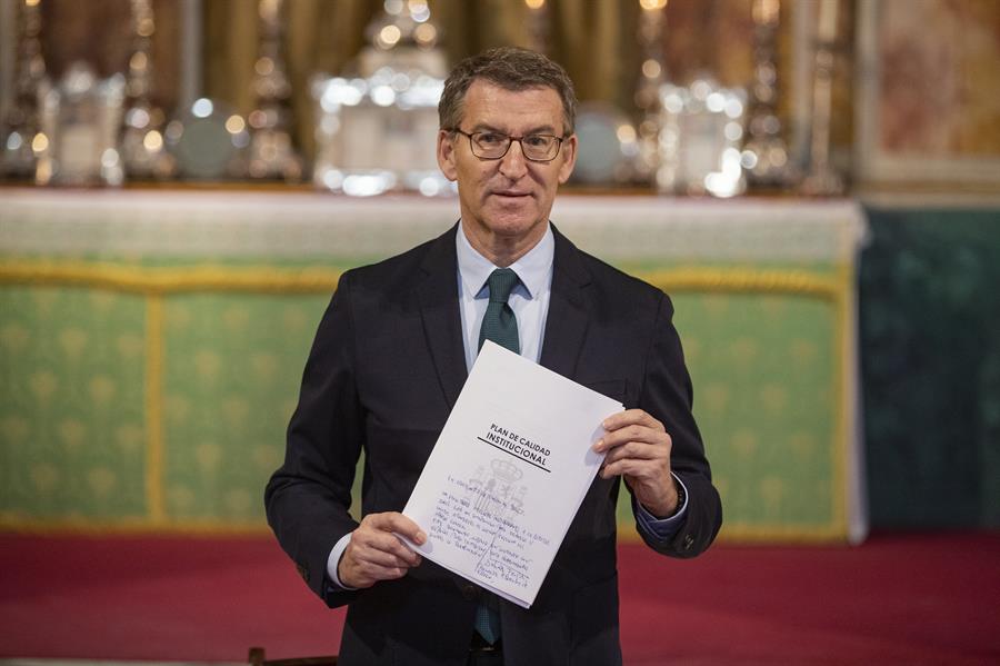 El presidente del Partido Popular, Alberto Núñez Feijóo, ha presentado este lunes su Plan de Calidad Institucional que incluye 60 medidas para acabar con «el nepotismo, opacidad y arbitrariedad», entre ellas que gobierne la lista más votada en las elecciones municipales.