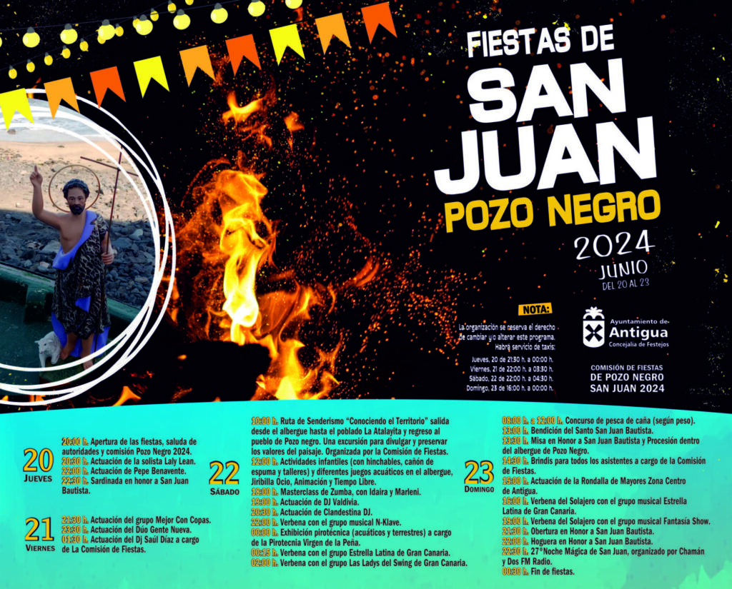 El municipio de Antigua celebra San Juan desde Pozo Negro. Por primera vez lo hará con el anto presente. La imagen será bendecida el 23 de junio y estará presenta en la tradicional sardinada, las Verbenas de Madrugada, el concurso de Pesca de Caña y la gigante hoguera de San Juan, a la que seguirá la Noche Mágica ofrecida por el Chamán.