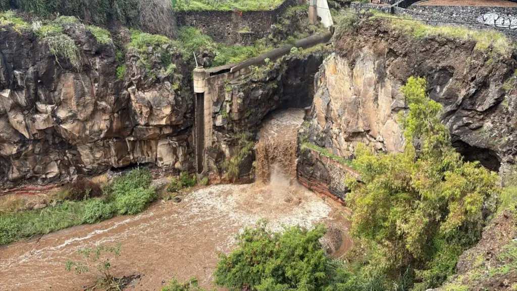 Las intensas lluvias de las últimas horas dejan imágenes como estas. Así se encuentra a esta hora el barranco del Camino del Hierro, en Santa Cruz de Tenerife.