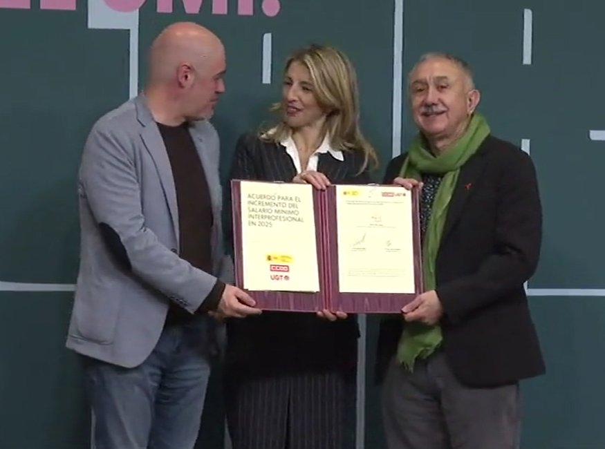 La vicepresidenta segunda y ministra de Trabajo, Yolanda Díaz ha firmado esta subida con los representantes de CCOO y UGT, Unai Sordo y Pepe Álvarez.