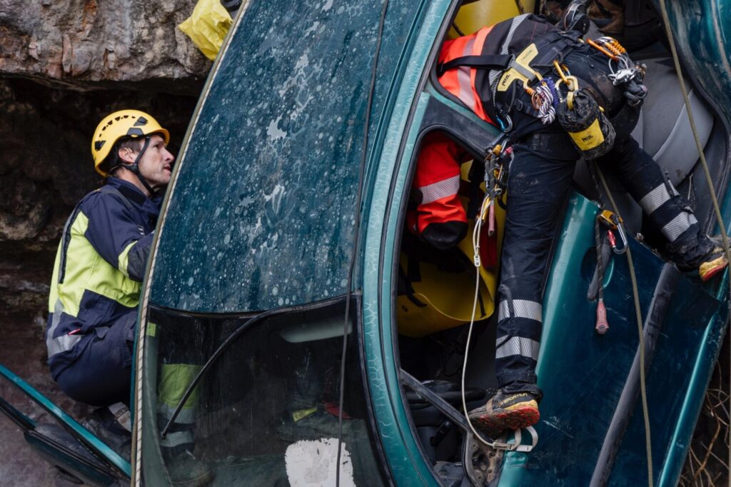 Uno de los momentos más esperados fue el entrenamiento en el sistema de recuperación de cuerda. Este método, usado en España solo por el grupo de Alta Montaña de la Guardia Civil, permite rescatar a víctimas en posiciones muy elevadas sin dejar la cuerda instalada. La placa tótem, pieza central de este sistema, permite la evacuación rápida de hasta cuatro personas asistidas por un rescatador.