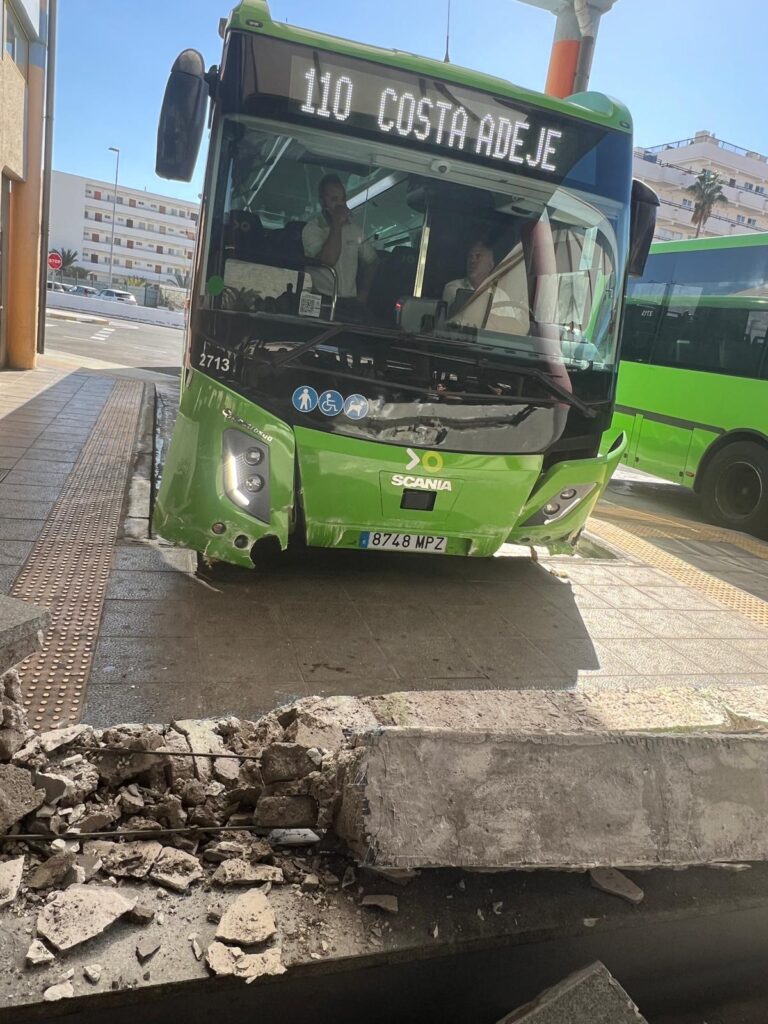 El impacto de la guagua de Titsa de la línea 110 en la estación de guaguas de Adeje (Tenerife) se ha registrado en la tarde de este miércoles.