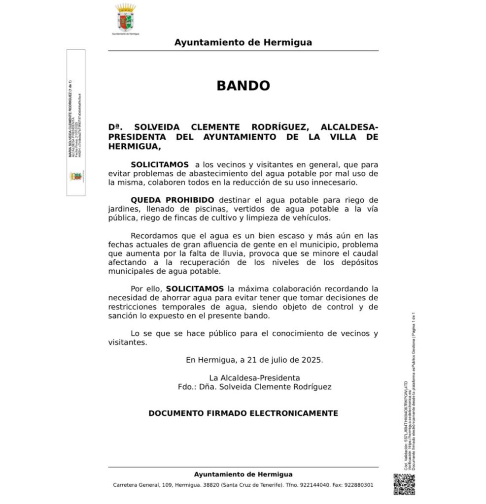 El bando prohíbe expresamente utilizar agua potable para regar jardines o cultivos, llenar piscinas, lavar vehículos o verterla en la vía pública. Además, advierte que estas restricciones serán objeto de control y sanción para quienes las incumplan.