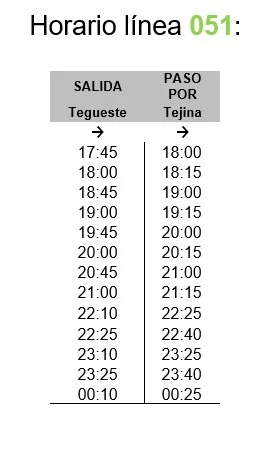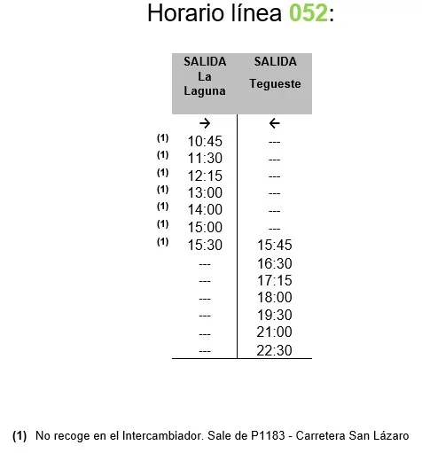 Se añadirán viajes a demanda entre las 10.00 hasta las 1.00 am. Saldrá desde El Intercambiador de La Laguna e irá por Vía de Ronda hacia Tegueste. Además, las líneas 050, 051, 052 y 057 añadirán más viajes, además de los habituales, en los siguientes horarios: