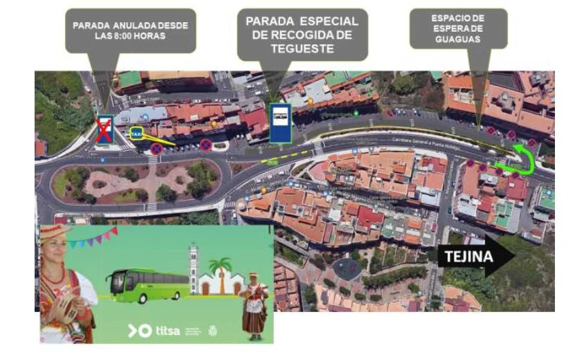 - Sentido Tegueste: entre las 10.00 y las 16.00 horas, la recogida de pasajeros/as se realizará fuera del Intercambiador, realizando el recorrido por la Vía de Ronda.