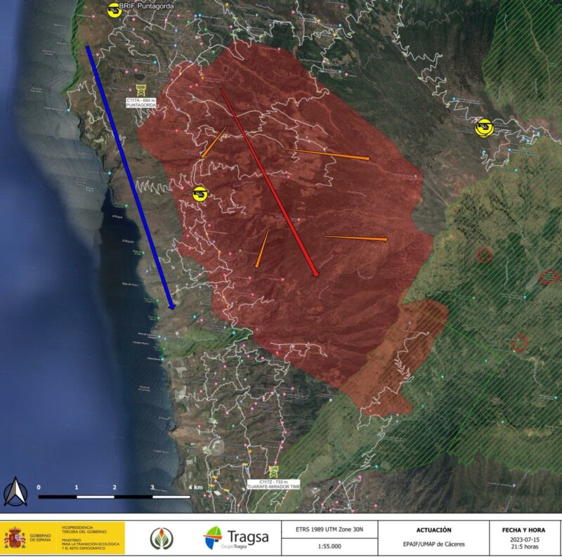 El incendio forestal de La Palma ha obligado a la evacuación de más de 4.000 personas mientras que una mejora en la contención del perímetro del fuego, que sigue sin estar controlado, hace que las hectáreas afectadas sean 4.765. En la imagen, estado del incendio en el municipio de Puntagorda este sábado por la noche. EFE/Miguel CaleroEl incendio forestal de La Palma ha obligado a la evacuación de más de 4.000 personas mientras que una mejora en la contención del perímetro del fuego, que sigue sin estar controlado, hace que las hectáreas afectadas sean 4.765. En la imagen, estado del incendio en el municipio de Puntagorda este sábado por la noche. EFE/Miguel CaleroImágenes de satélite de la zona afectada por el incendio de Puntagorda en La Palma Dos fotografías de Pedro Hernández desde Puntagorda compartidas por el perfil de twitter Elmorromazo Imagen publicada por el Cabildo de La Palma en twitter donde se observa la superficie afectada por el incendio forestal declarado este sábado en el término municipal de Puntagorda, actualizada a las 20.15 horas. Se calcula que son unas 4.500 hectáreas. Antes de caer la noche, el primer hidroavión del 43 Grupo del Ejército del Aire se unió al dispositivo de medios desplegado en La Palma. Mañana se sumará el segundo / 112 Canarias Reunión del CECOES / Twitter Ministro de Turismo Héctor Gómez .Imagen del atardecer desde Los Llanos de Aridane / Moisés Rodríguez Un camión cisterna acude al incendio forestal declarado en la Palma, a 15 de julio de 2023, en Puntagorda, La Palma, Canarias (España). Europa Press / Europa Press 15/7/2023Humo provocado por el incendio forestal declarado en la Palma, cerca de una vivienda, a 15 de julio de 2023, en Puntagorda, La Palma, Canarias (España). Europa Press / Europa Press 15/7/2023Un vecino observa desde el tejado de una casa el incendio forestal declarado en la Palma, cerca de una vivienda, a 15 de julio de 2023, en Puntagorda, La Palma, Canarias (España). Europa Press / Europa Press 15/7/2023Vecinos observan el incendio forestal declarado en la Palma, cerca de una vivienda, a 15 de julio de 2023, en Puntagorda, La Palma, Canarias (España). Europa Press / Europa Press 15/7/2023Miembros de las Brigadas de Refuerzo en Incendios Forestales (BRIF) trabajan en las labores de extinción del incendio forestal declarado en la Palma, cerca de una vivienda. Europa Press / Europa Press 15/7/2023LLamas cerca de una vivienda en el incendio forestal declarado en la Palma, a 15 de julio de 2023, en Puntagorda, La Palma, Canarias (España). Europa Press / Europa Press 15/7/2023Vista desde el municipio de Los Llanos de Aridane de la columna de humo del incendio forestal declarado en Puntagorda en la madrugada de este sábado en la isla de La Palma. EFE / Luis G MoreraGRAFCAN3937. LOS LLANOS DE ARIDANE (LA PALMA) (ESPAÑA), 15/07/2023.-Vista desde el municipio de Los Llanos de Aridane de la columna de humo del incendio forestal declarado en Puntagorda en la madrugada de este sábado en la isla de La Palma. EFE / Luis G MoreraVista del incendio desde Los Llanos de Aridane / May Navarro Imagen del espacio habilitado en Tazacorte para atender a los evacuados / Cruz Roja El Roque de los Muchachos ha sido desalojado por precaución Imagen desde el Roque de los Muchachos que ha detenido su actividad por el incendio / Gran Telescopio de CanariasImagen captada por la Atbrif del incendio de Puntagorda en La Palma a las 14:05El incendio de Puntagorda visto desde el pueblo de Tijarafe (15:04) Imagen tomada a las 15.00h desde el Parque Infantil Barbarroja, en casco urbano de Tijarafe / Carlo Brusini Cruz Roja está apoyando en el avituallamiento para los intervinientes, así como nuestro Centro de Operaciones Autonómica se encuentra en pleno rendimiento controlando y movilizando los recursos necesarios / Cruz Roja