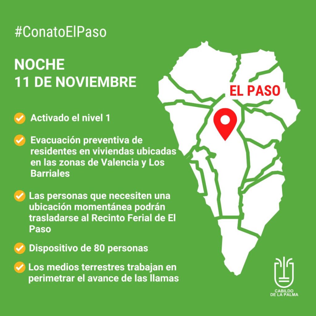 Durante la noche se ordenó la evacuación preventiva de los residentes en viviendas ubicadas en las zonas de Valencia y Los Barriales. Asimismo, han ndicado que las personas que necesiten una ubicación momentánea podrán trasladarse al recinto ferial de El Paso.