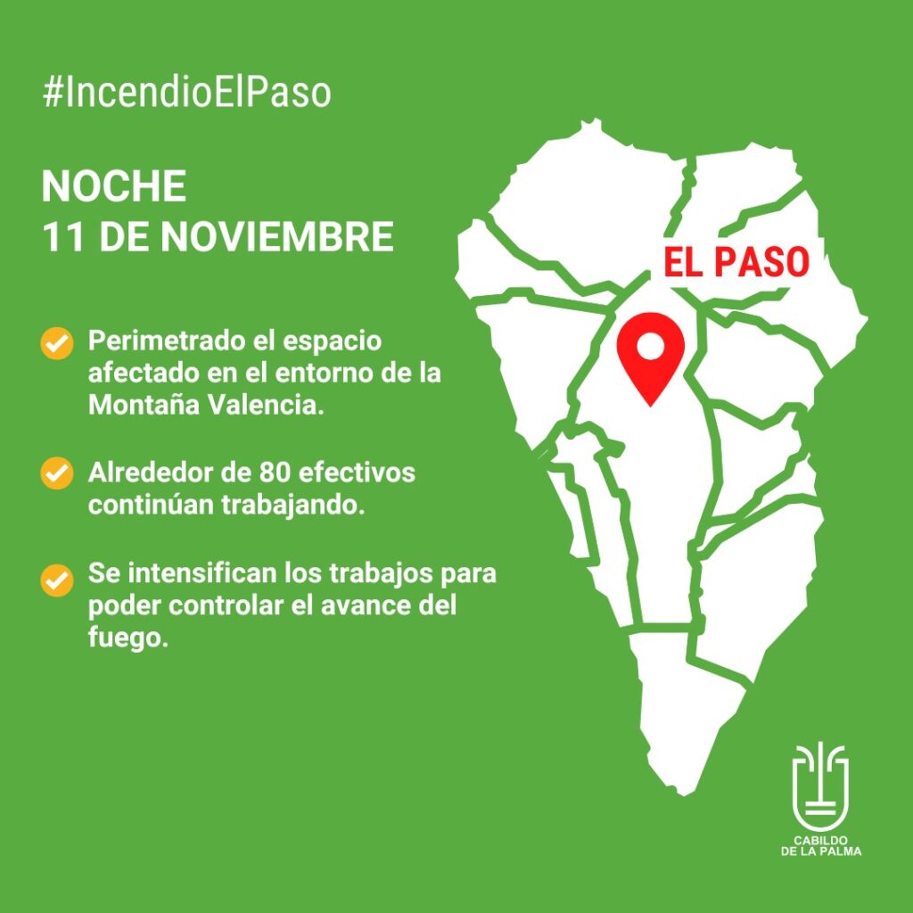 Desde las 19:00 horas, el incendio forestal de El Paso se dio por controlado. El fuego fue contenido gracias a la rápida intervención de los cuerpos de emergencia y las condiciones meteorológicas.