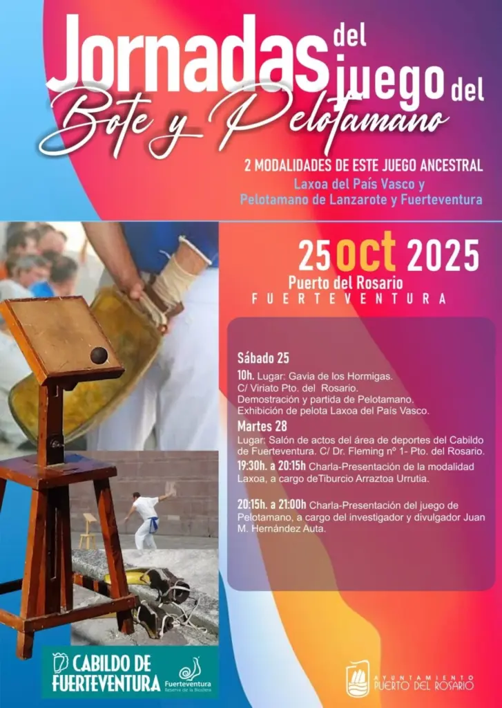 El martes 28 de octubre a las 19:30 horas en el salón de actos del área de Deportes del Cabildo de Fuerteventura con una charla-representación sobre el juego Laxoa, a cargo de Tiburcio Arraztoa Urrutia, experto y representante de esta modalidad vasca. Posteriormente, a las 20:15 horas, el investigador y divulgador Juan M. Hernández Auta presentará la modalidad de Pelotamano, una práctica tradicional canaria que combina historia, destreza y trabajo en equipo.