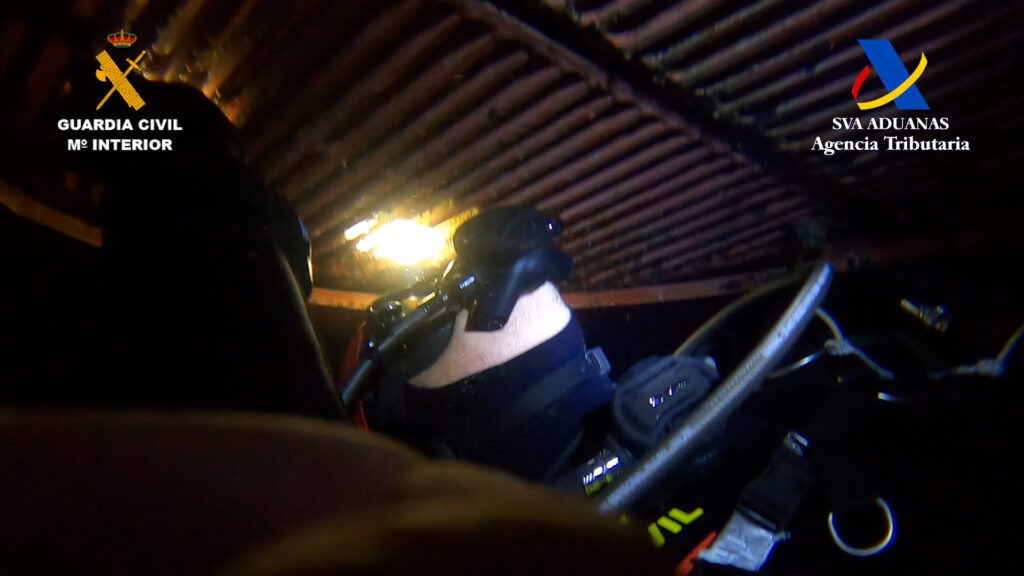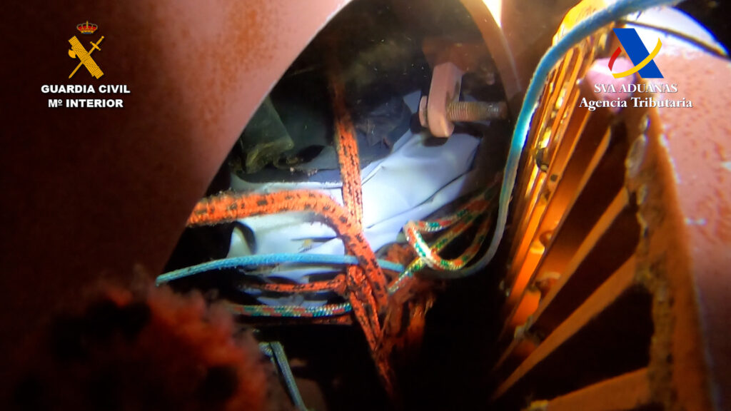 Durante el transcurso de la inspección de la carga y del resto de zonas comunes de la embarcación, los agentes detectaron hasta un total de ocho fardos. El hallazgo se produjo durante la revisión de una tobera de toma de agua de refrigeración de la maquinaria del buque, efectuada desde el exterior del casco por personal del equipo de actividades subacuáticas de la Guardia Civil (GEAS).