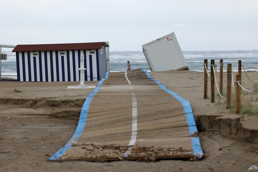 Canet d’En Berenguer ha cerrado sus playas después de haber sufrido esta madrugada una tromba de agua que ha dejado 132 litros por metro cuadrado en apenas una hora y que se ha llevado las pasarelas y ha traído el agua del mar hacia la arena.