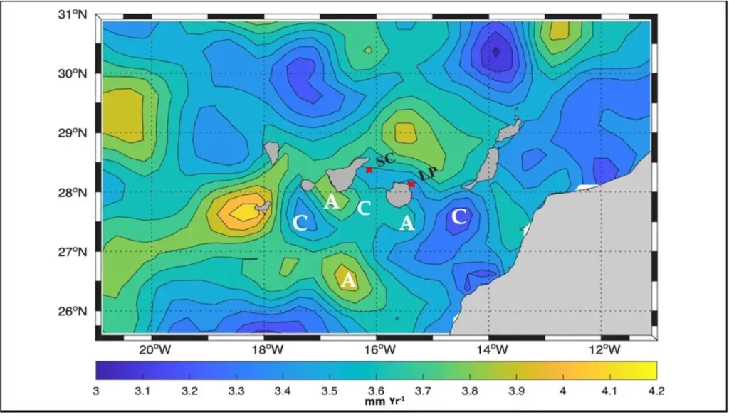 Este trabajo aporta estimaciones del nivel del mar gracias al uso de series temporales lo suficientemente largas, consistentes y completas para conocer cómo ha evolucionado el nivel del mar en las costas de las Islas. Además de registrar el incremento señalado, los investigadores han constatado que la subida no ha afectado por igual a toda la región, ya que los remolinos oceánicos influyen de forma decisiva. Estos remolinos, equivalentes en el mar a las borrascas y a los anticiclones atmosféricos, modifican la circulación oceánica general de las zonas donde actúan. En las áreas donde predominan los remolinos ciclónicos, estos fenómenos reducen el aumento al provocar el hundimiento de la superficie marina, mientras que en las zonas con mayor presencia de remolinos anticiclónicos, dichos remolinos intensifican el incremento.