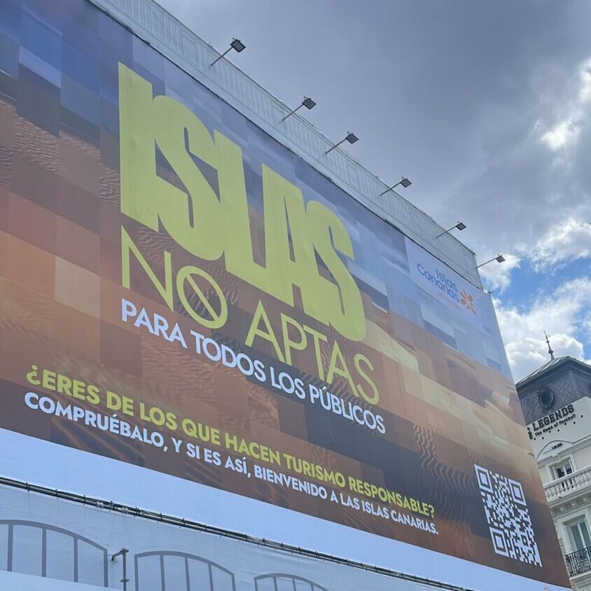 Con la finalidad de llegar de manera impactante a los potenciales turistas, se ha desplegado una enorme lona que cubre tres fachadas de un edificio ubicado en la céntrica plaza de Sol, en Madrid, con el mensaje ‘Islas no aptas para todos los públicos’ e imágenes pixeladas de distintos puntos del archipiélago.