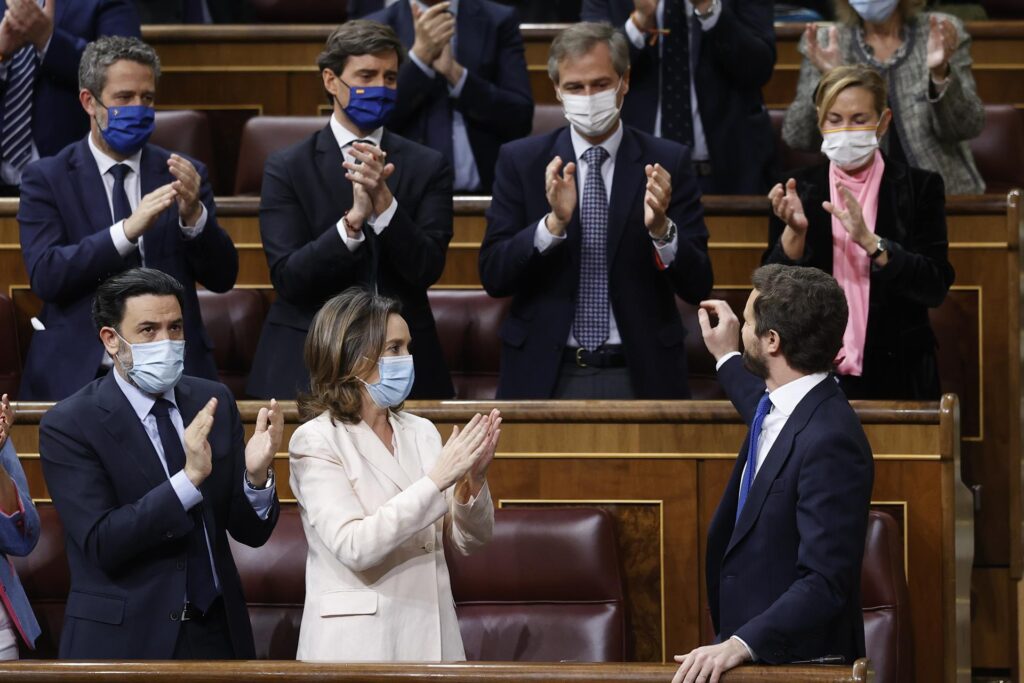 Juntos han aplaudido entonces los diputados de su grupo, casi ceremonialmente, como si todo respondiera a un guion, algunos con más fuerza que otros, hasta que se han ido levantando poco a poco, extendiendo la ovación de modo que Casado se ha dado la vuelta, se ha puesto también en pie y se ha quitado la mascarilla para saludar.