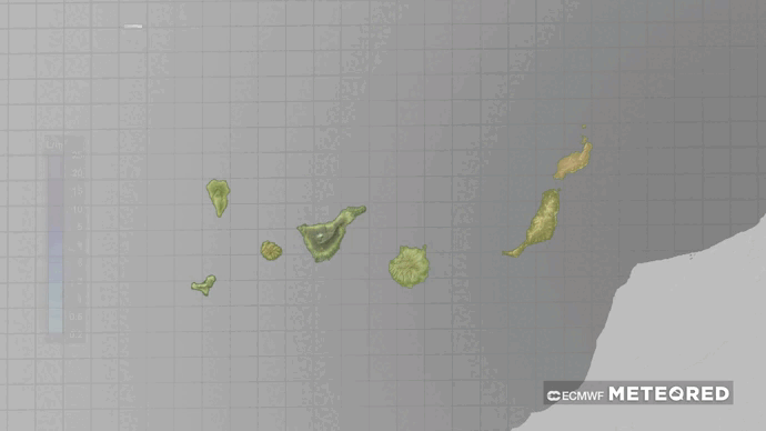 También probabilidad de lluvias en las medianías del norte de la isla de Gran Canaria. Las precipitaciones más persistentes caerían en las medianías del este y del norte de la isla de La Palma.