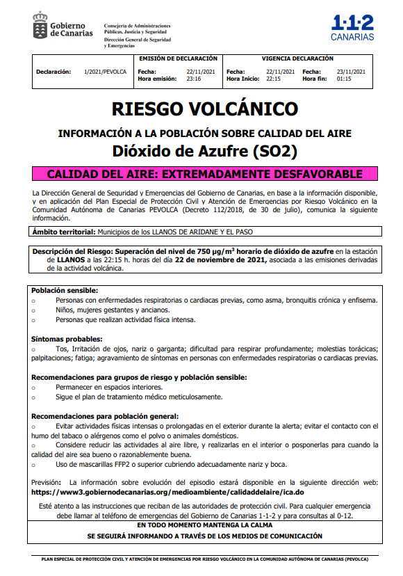 La calidad del aire en los municipios de los Llanos de Aridane y El Paso es «extremadamente desfavorable», según ha notificado la Dirección General de Seguridad y Emergencias del Gobierno de Canarias.