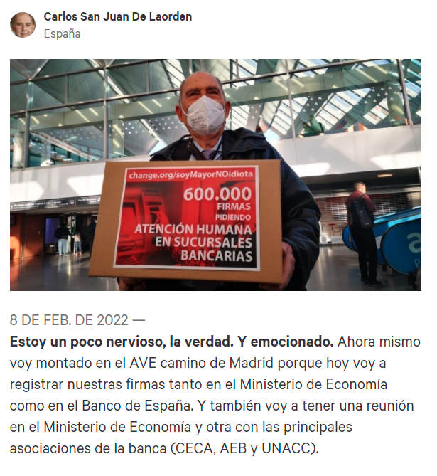 «Tengo casi 80 años y me entristece mucho ver que los bancos se han olvidado de las personas mayores como yo», lamenta Carlos San Juan en la petición.