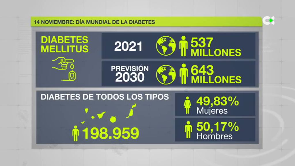 Las previsiones para 2030 son de 643 millones y para 2045, de 783 millones de personas afectadas. En Canarias hay actualmente un total de 198.959 personas diabéticas de todos los tipos, de los que el 49,83 por ciento son mujeres y el 50,17 por ciento son hombres.