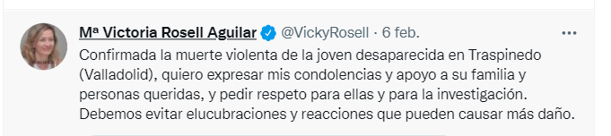 La delegada del Gobierno contra la Violencia de Género, Victoria Rosell, confirmó el pasado domingo en su cuenta personal de Twitter, la muerte violenta de Esther.