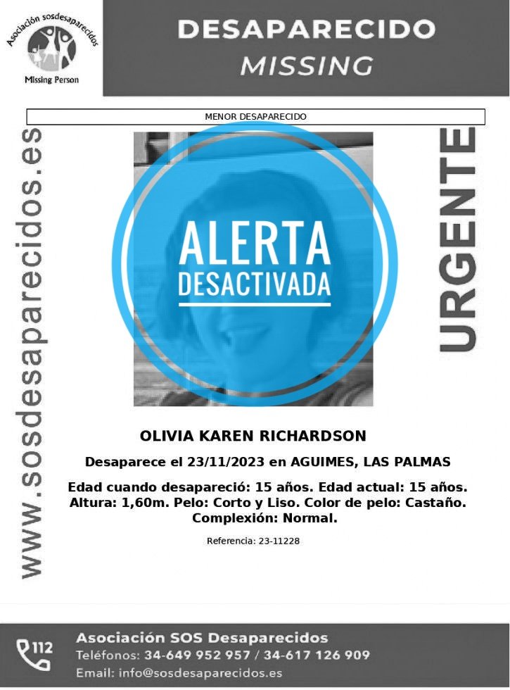 La menor, Olivia Karen R., es residente en Gran Canaria, aunque natural de Gibraltar, mide 1,60 metros, tiene una complexión normal y el pelo castaño, liso y corto.