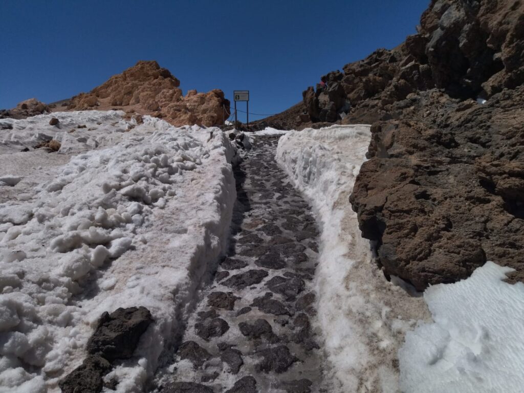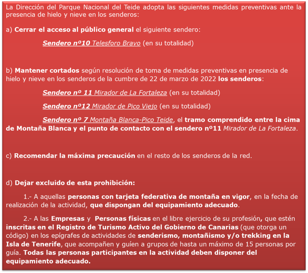Los senderos cerrados por presencia de nieve y hielo son el número 10 (Telesforo Bravo), el 11 (Mirador de La Fortaleza), el 12 (Mirador de Pico Viejo) y el 7 Montaña Blanca-Pico Teide