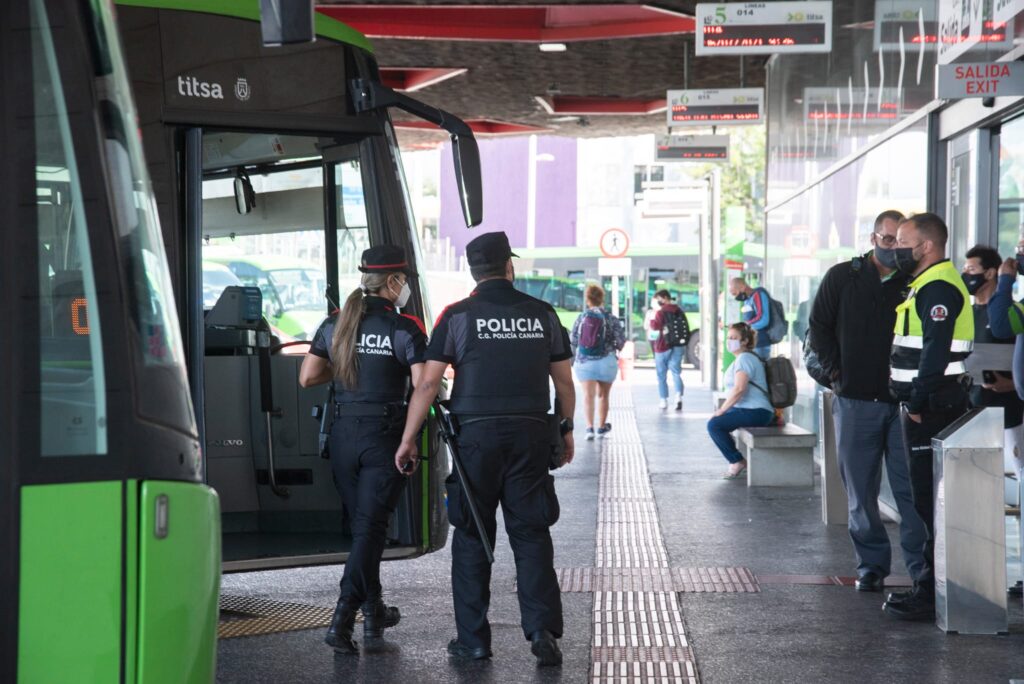 Otros de los puntos de vigilancia que han establecido, son lugares en los que podrían producirse aglomeraciones. Por eso han permanecido en la estación de guaguas y también en las paradas del tranvía. Los agentes también se han introducido en los vagones para comprobar que se cumplía con el aforo máximo permitido y las distancias de seguridad entre los pasajeros.