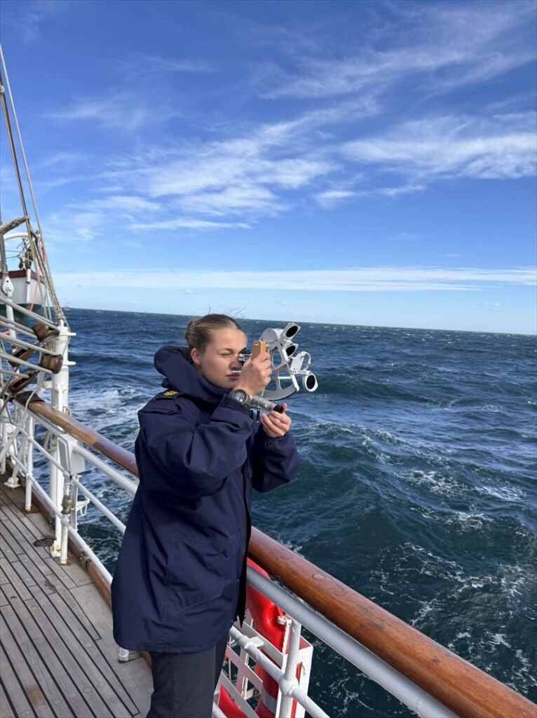 En las fotografías se puede ver a la princesa a bordo de una embarcación con el buque escuela al fondo y en las labores de formación que realizan en la cubierta y subidos a gran altura a los mástiles para recoger velas.