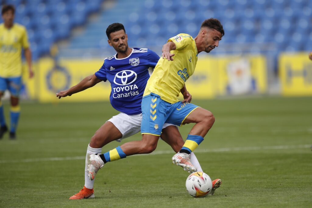 El conjunto amarillo demostró tener más ritmo que su rival, de Segunda RFEF, y mandó desde el inicio, adelantándose en el marcador con dos tempraneros tantos, del gallego Óscar Pinchi, quien se estrenó con su nuevo equipo, y del tinerfeño Kirian Rodríguez, quien repetiría antes del descanso con un disparo de media distancia.