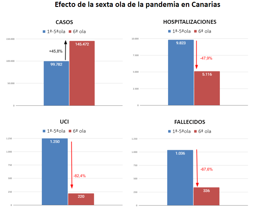 Las vacunas contra la covid-19 no solo han salvado miles de vidas en el último año, sino que en esta sexta ola han protegido a los hospitales del colapso: con casi un 46 % más de casos concentrados en solo dos meses que en todo el resto de la pandemia. Ha habido un 48 % menos de ingresos y un 82 % menos de pacientes que necesitaron cuidados intensivos en el caso de Canarias.