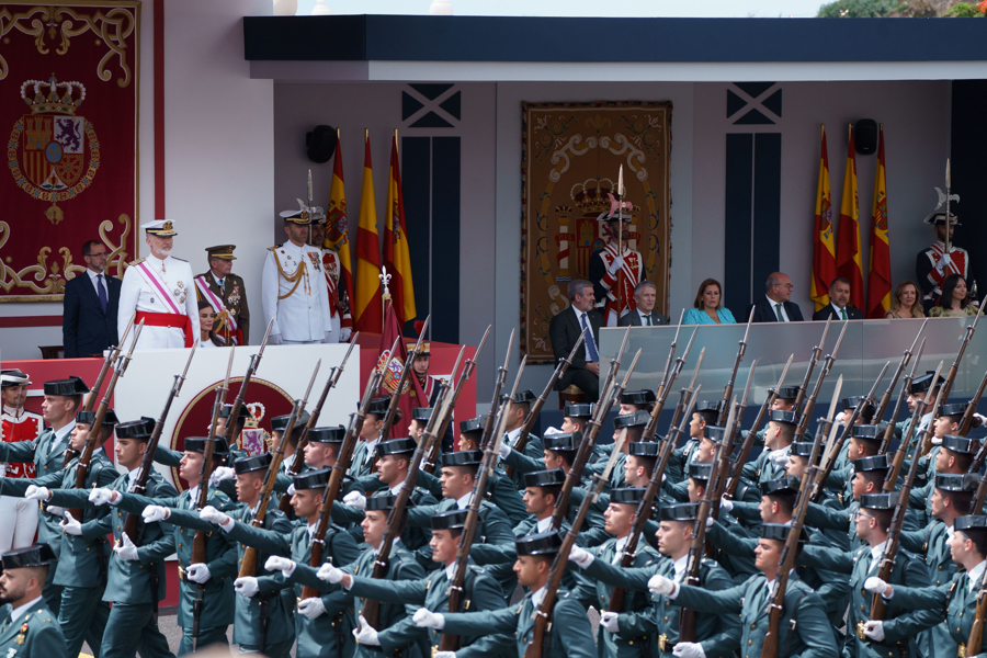- Desfile a pie: seis agrupaciones con unidades de la Guardia Real, Armada, Ejército del Aire y del Espacio, UME, Guardia Civil y Regulares de Melilla