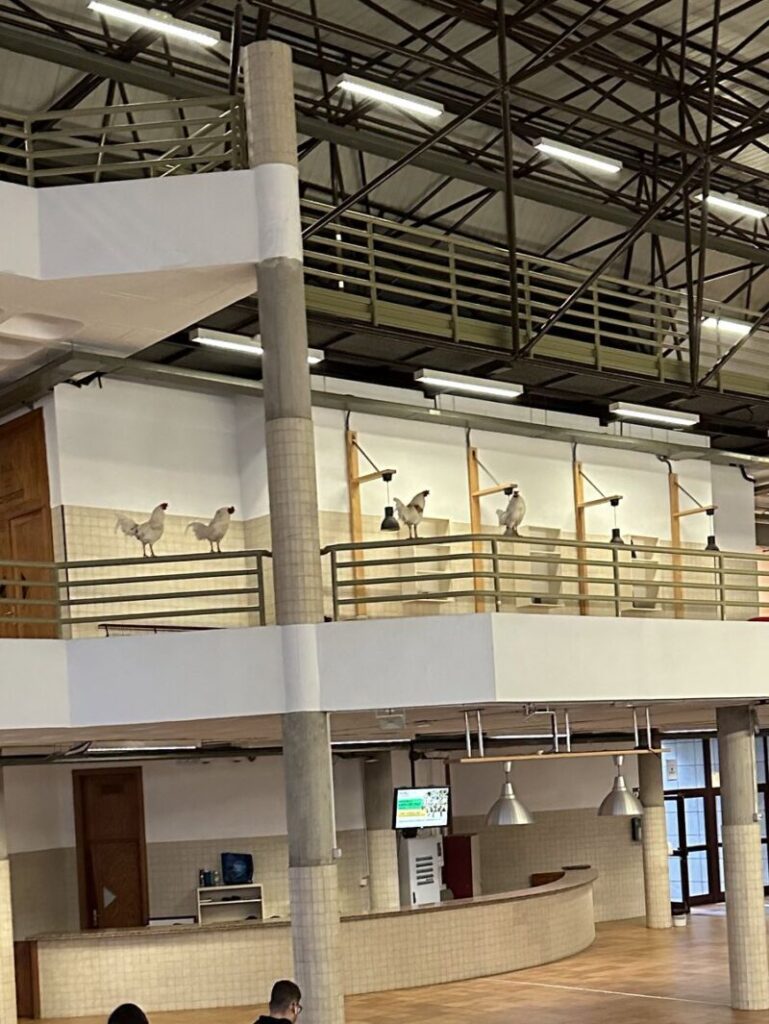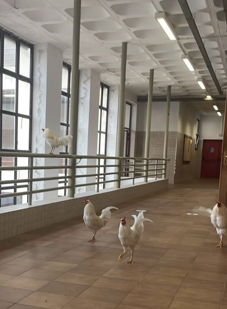 Los alumnos de este centro no saben cómo han llegado hasta allí, pero sí que se han convertido en protagonistas de sus publicaciones en las redes sociales, convirtiéndose en virales. Las gallinas no solo están por los pasillos, también se sientan como oyentes en las clases.