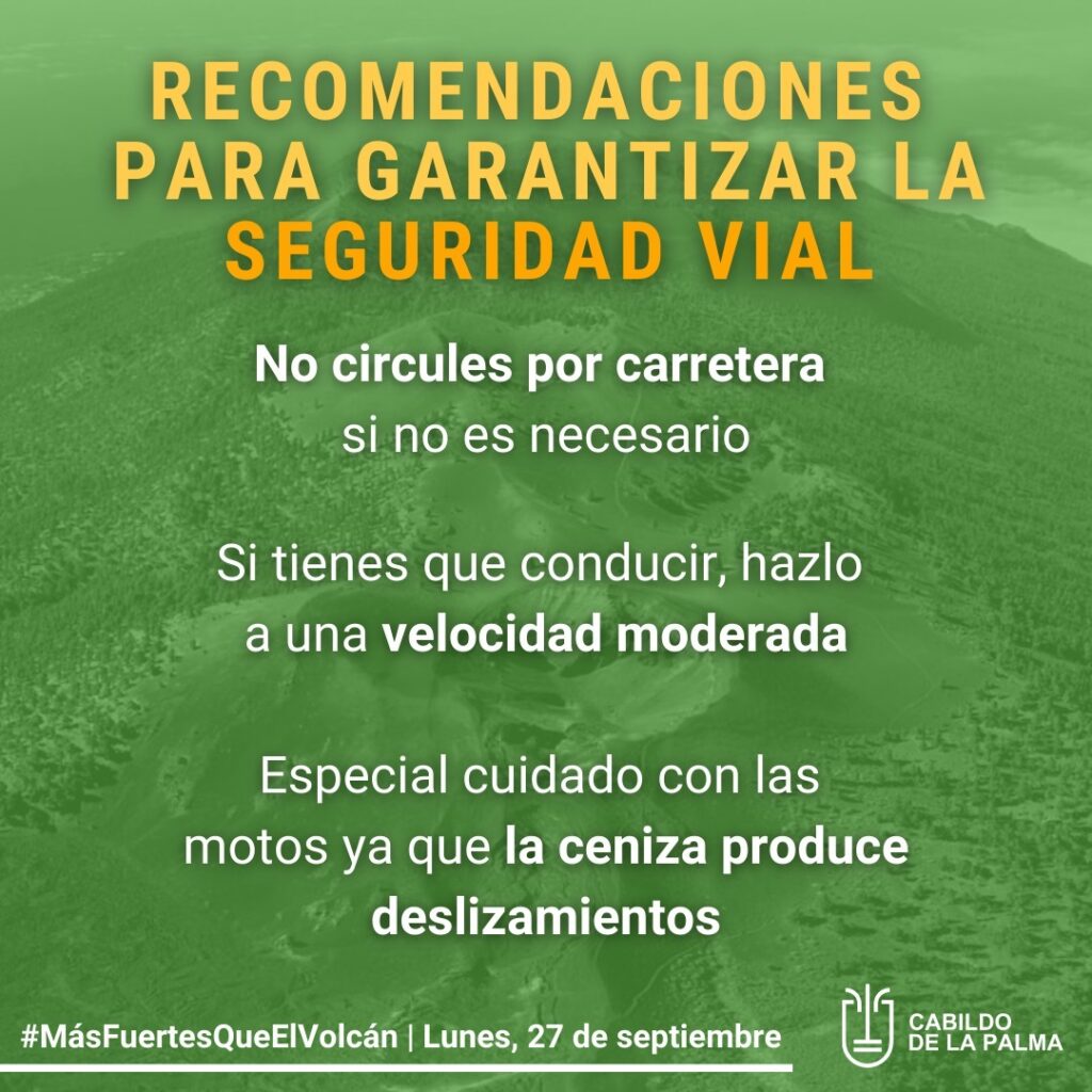 El Cabildo señala que tras las últimas horas, en las que se ha depositado una gran cantidad de ceniza en las carreteras de toda la isla, es muy importante conducir con precaución. Hay que extremar la seguridad para evitar derrapes y accidentes.